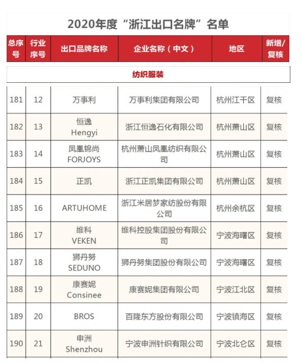 日前,浙江省商務廳公布了2020年度“浙江出口名牌”名單,維科集團“維科VEKEN”通過復核,再獲“浙江出口名牌”稱號,有效期為三年(2021--2023年)。加上之前評定的尚在有效期內的興洋KōYō、天雪TISNOW品牌(有效期2019--2021年),集團目前已有三個“浙江出口名牌”。
