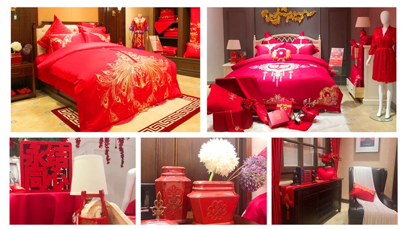 為帶給顧客更直觀舒適的消費體驗,在空間設計上,維科家紡和義店二樓婚慶家紡場景展示區摒棄了家紡行業傳統高柜+展床以求陳列面最大化的方式,將300余平方的空間分隔成7個實景樣板間,真實體現婚慶床品在日常家居生活中的應用效果,也能滿足顧客在選購婚慶床品的同時,一站式解決對婆婆禮、長輩禮以及婚慶小件(子孫桶、火銃、虎頭鞋等)的需求。該區域設置了一大一小兩個洽談區,配備了舒適的沙發以及精致的茶歇,以供顧客能夠坐下來向導購詳細了解床品的信息,以優質的消費體驗,滿足顧客的選購需求。在陳列布置上,當季新品醉紅妝、子孫滿堂、胭脂醉,熱銷品百子納福、麒麟賀滿堂等都直接鋪設于房間內,并搭配生活化的情景道具,供顧客選購。