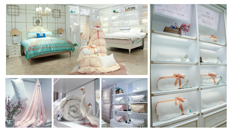 芯類產品一直以來都是家紡行業銷售的大頭,為進一步提高和義店芯類產品銷售業績,公司對一樓原有空間進行重新規劃,特別開辟了80余平方的獨立芯類區,設計上采用白色貨柜、鍍鈦金屬件、金屬玻璃柜的組合,使整個芯類區更加通透明亮。維科家紡主打的維科朵絨被、蠶絲被、石墨烯纖維被等都在該區域以展床、垂掛、卷筒等不同形式集中展示。此外,售價近三十萬的鎮店之寶——至尊冰島雁鴨絨被,也首次亮相和義店。