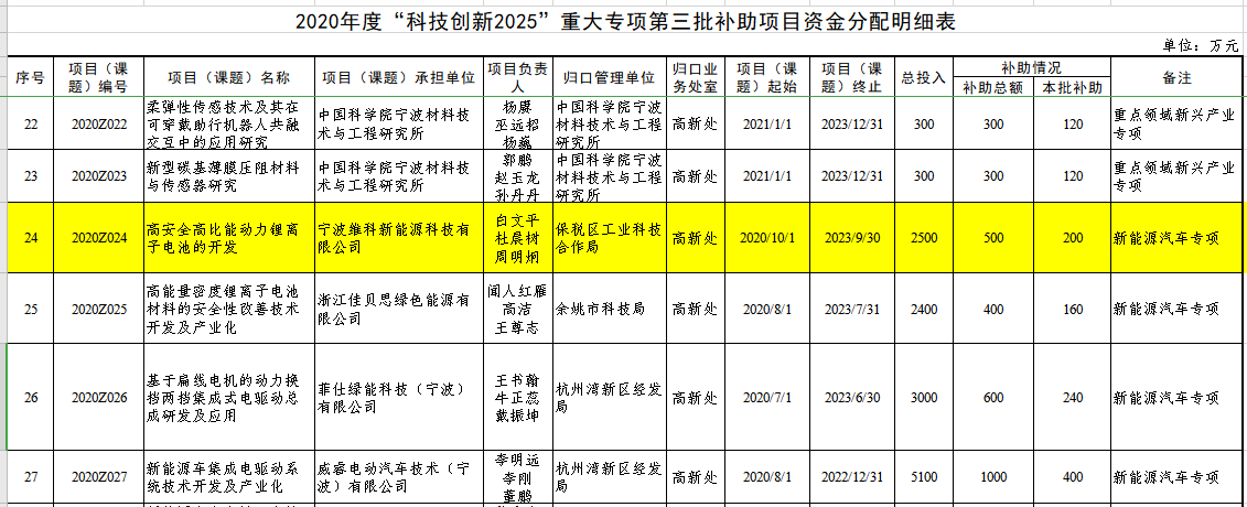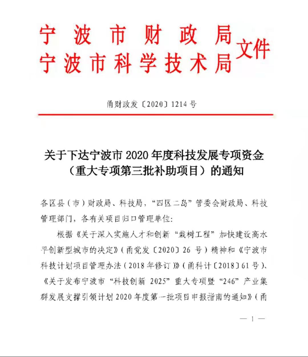 12月15日、寧波市財政局は「寧波市2020年科學技術発展特別基金(第3回バッチ補助金の主要特別プロジェクト)の発行に関する通知」(Ningbo Finance [2020] No.1214)を発行し、寧波VEKEN新エネルギーテクノロジー有限公司が宣言した「高安全?高比エネルギー動力リチウムイオン電池の開発」プロジェクトが採択された。 2020年に寧波市から「科學技術革新2025」大型特別プロジェクトの受注に成功し、第一期の補助金200萬元を獲得した。