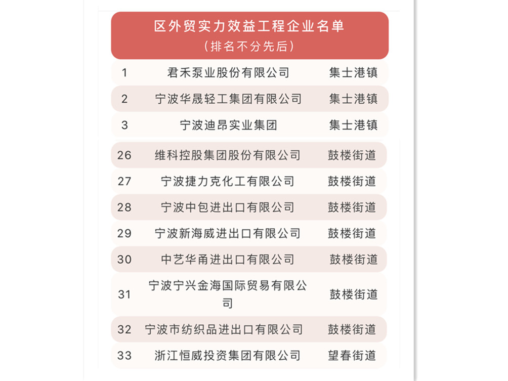 基幹対外貿易企業のリード?モデルの役割を十分に発揮し、海曙區の広範な対外貿易企業が國際國內二循環の新発展構造に積極的に溶け込むよう促進するため、市商務局の関連要求に基づき、海曙區の実情と結び付けて、2021年海曙區対外貿易実力利益プロジェクト及び対外貿易実力育成プロジェクトを実施することを決定した。 総合採點の方法を経て、最終的に海曙區対外貿易実力利益プロジェクト企業40社(流通型、生産型各20社)と海曙區対外貿易実力育成プロジェクト企業10社を選出し、VEKENがランクインした。