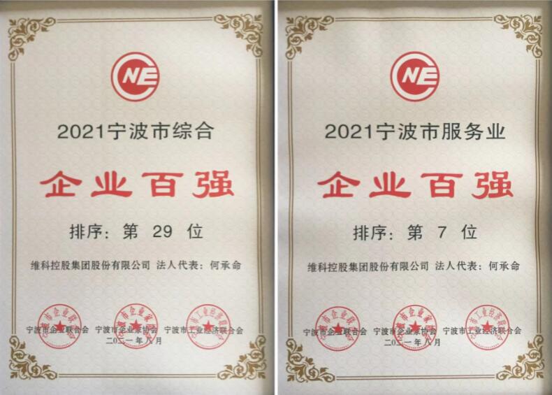 VEKEN集団は2021寧波市総合百強企業、サービス業百強企業の栄譽を獲得