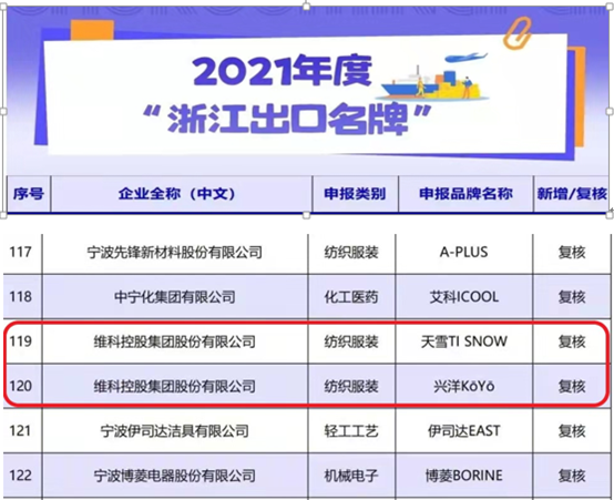 このほど、浙江省商務(wù)庁は、2021年度の「浙江輸出ブランド」のリストを発表した。維科グループ傘下の興洋KOYO、天雪TI SNOWの2つのブランドは順調(diào)に再審査を通過し、「浙江輸出ブランド」の栄譽(yù)を再獲得し、有効期間は3年(2022-2024年)である。