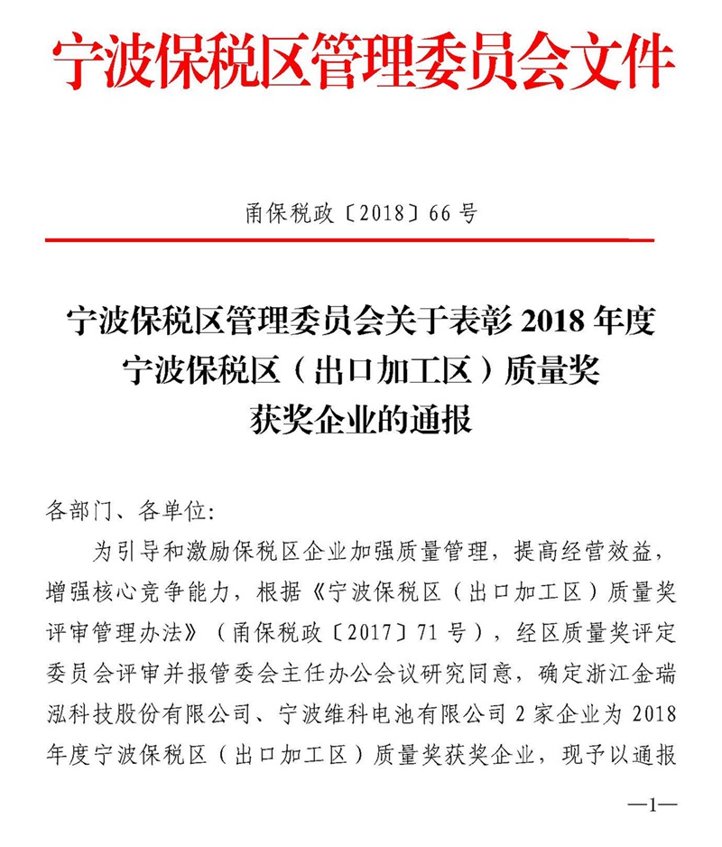 2018年11月4日、寧波市保稅區(qū)管理委員會は文章を公開して通報した。そのうち、2018年度寧波保稅區(qū)(輸出加工區(qū))品質賞受賞企業(yè)を表彰し、維科技術旗子會社寧波維科電池有限會社がこの栄譽を受賞し、區(qū)內の第1回品質賞が2社しかない企業(yè)の一つとなった。