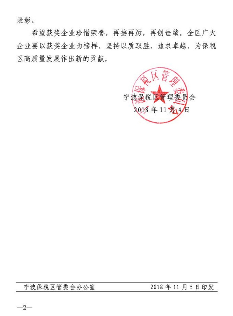 「寧波保稅區(qū)(輸出加工區(qū))品質賞」は寧波保稅區(qū)(輸出加工區(qū))管理委員會が設立した最高品質栄譽であり、主に本區(qū)に獨立法人資格を有し、卓越した品質管理経営モデルを実施し、業(yè)界內で広範な知名度と影響力があり、著しい社會効果または経済効果を得た企業(yè)(組織)に授與される。